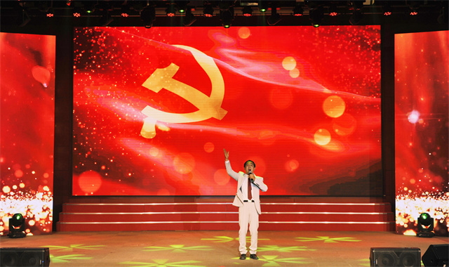 开云软件公司领导班子成员带领总部干部齐声高唱《没有共产党就没有新中国》拉开了文艺汇演的序幕。