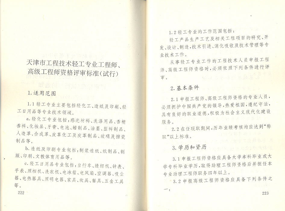 天津市工程技术轻工专业工程师、高级工程师资格评审标准